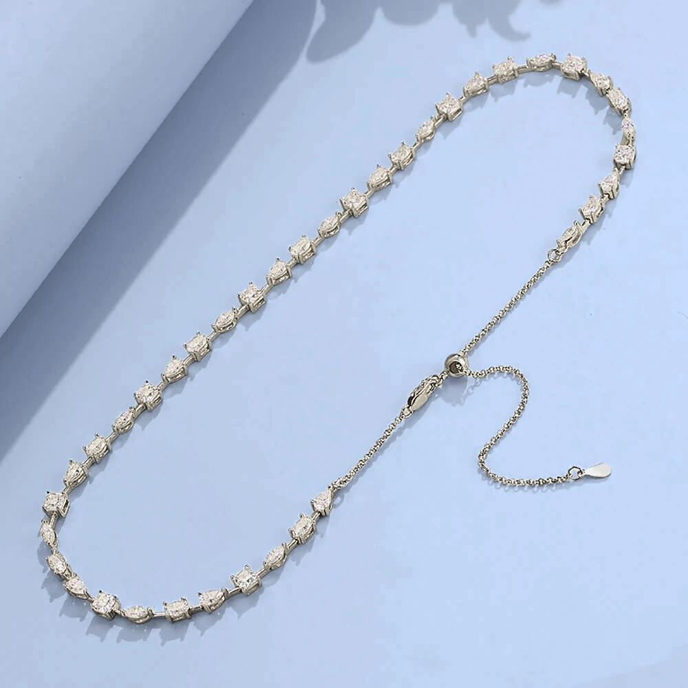 La parte frontale della collana è composta da una successione ritmata di castoni che alternano quattro tagli iconici della gioielleria: goccia, ovale, marquise e Asscher. Ogni pietra è collegata alla successiva da una sottile barretta verticale in metallo lucido, un dettaglio architettonico che dona continuità visiva e rafforza la struttura del design. Questa costruzione crea un effetto dinamico e ordinato, dove ogni taglio dialoga con l’altro senza sovrapporsi, valorizzando la composizione nel suo insieme.