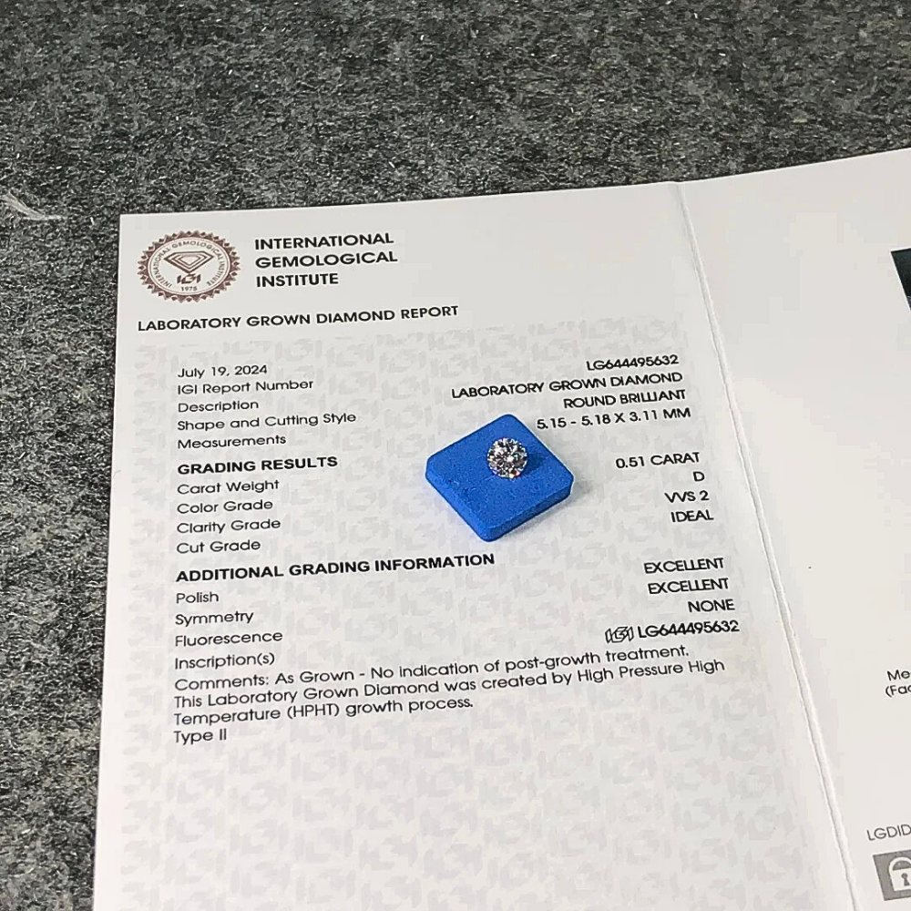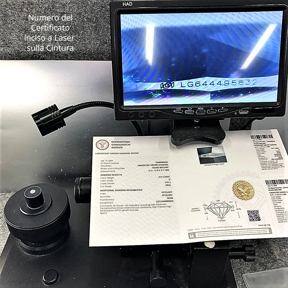 Ogni diamante viene valutato dal laboratorio internazionale IGI, la stessa autorità riconosciuta nel mondo per l’analisi gemmologica più rigorosa. Il certificato include tutti i parametri gemmologici che contano: caratura, colore, purezza, taglio, simmetria, lucidatura, proporzioni e fluorescenza. Esattamente come avviene per un diamante estratto, anche il Lab Grown porta inciso sulla cintura un numero seriale identificativo riportato sul certificato. L’unica differenza è la sigla LG prima del numero, un dettaglio che non diminuisce il valore ma ne aumenta la trasparenza e la tracciabilità. Il cliente ha così la garanzia di possedere una pietra autentica, certificata e verificabile in qualsiasi momento.