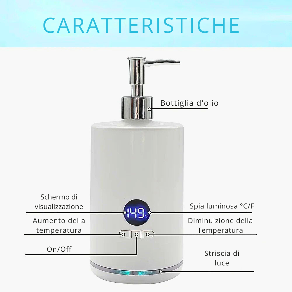 Il calore negli oli da massaggio non è solo un comfort: è un vero e proprio veicolo di principi attivi. Gli oli riscaldati penetrano più facilmente nella pelle, nutrendola e rendendola morbida, elastica e luminosa, mentre gli aromi essenziali si sprigionano intensificando l’esperienza sensoriale. Cannella, lavanda, agrumi e altre essenze rivelano così tutta la loro efficacia, stimolando la circolazione, rilassando la mente e favorendo un benessere multisistemico che coinvolge corpo e spirito. Ogni sessione diventa un rituale di lusso e piacere sensoriale, capace di trasformare la tua casa in un santuario di benessere quotidiano.: la pelle percepisce il calore come un abbraccio rassicurante, il massaggio si arricchisce dei benefici terapeutici dei principi attivi e la mente si libera dallo stress, ritrovando equilibrio e serenità. Il dispositivo, completo di contenitore riscaldante e dispenser per oli, unisce tecnologia avanzata, sicurezza e praticità, trasformando anche il più semplice massaggio in un’esperienza di cura profonda. Questi i principali effetti riconducibili al calore: