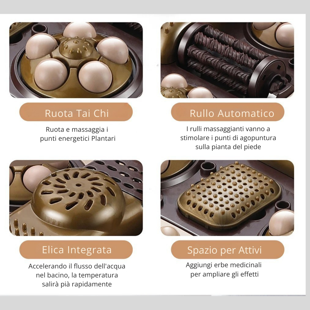 Sul fondo della vasca sono integrate ruote Tai Chi con 5 sfere lisce e una sfera centrale in rilievo, pensate per dita e talloni, mentre rulli automatizzati lavorano simultaneamente sulla pianta del piede. Le tecniche simulate – impastamento, pressione, spremitura e rotolamento – riproducono fedelmente la manualità umana, agendo sui punti energetici più sensibili per alleviare rigidità, riattivare la microcircolazione e restituire leggerezza a tutto il corpo.