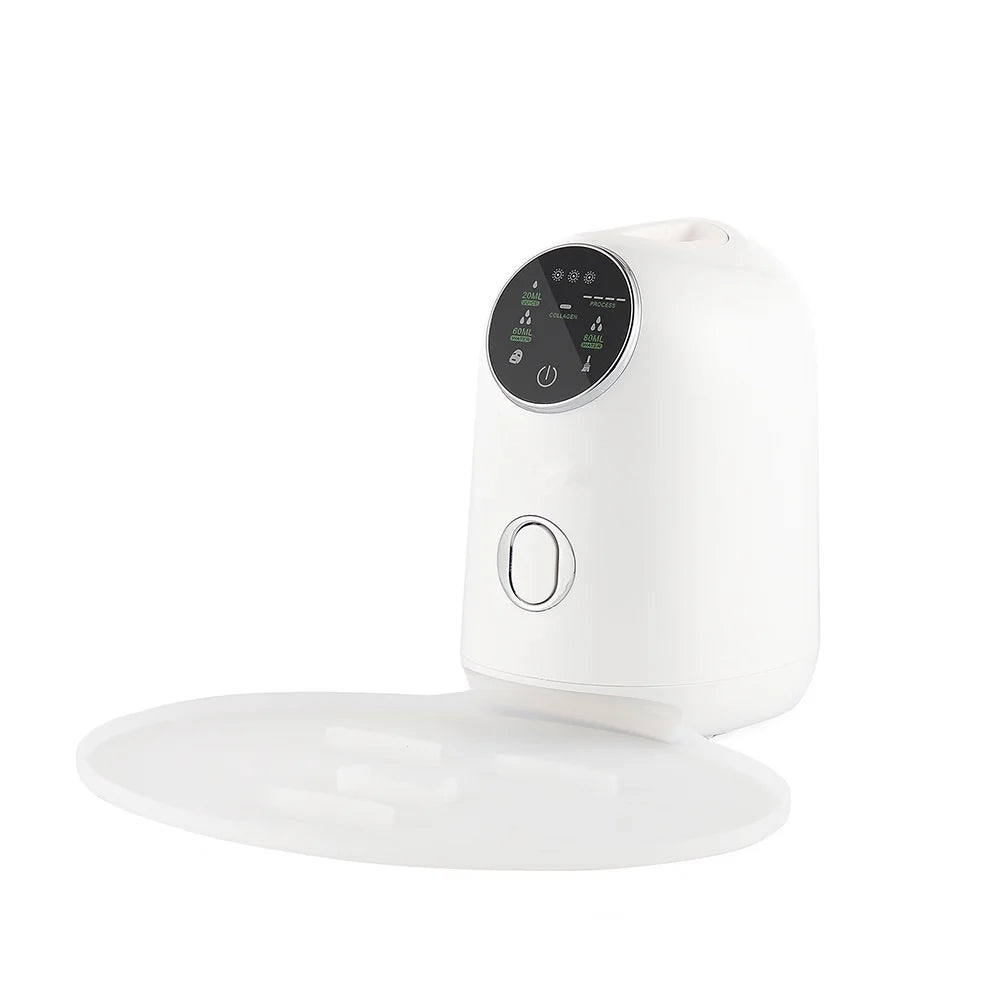 Collega l’apparecchio alla corrente e premi a lungo il pulsante di accensione. Aggiungi acqua e ingredienti naturali a scelta, e se desideri, l’Attivatore di Maschera Facciale. Puoi anche integrare principi attivi liquidi venduti separatamente, come collagene, acido ialuronico o sericina, per potenziare ulteriormente l’effetto della maschera. Premi il pulsante di avvio per preparare la maschera e posiziona lo stampo sotto la porta di scarico. Dopo il rilascio del liquido, il dispositivo entra automaticamente in modalità pulizia: aggiungi acqua, utilizza la spazzola interna e premi i pulsanti per scaricare il liquido residuo. L’uso costante permette di ottenere maschere dalla texture perfetta e dai risultati professionali, con una pelle visibilmente più luminosa, elastica e idratata.