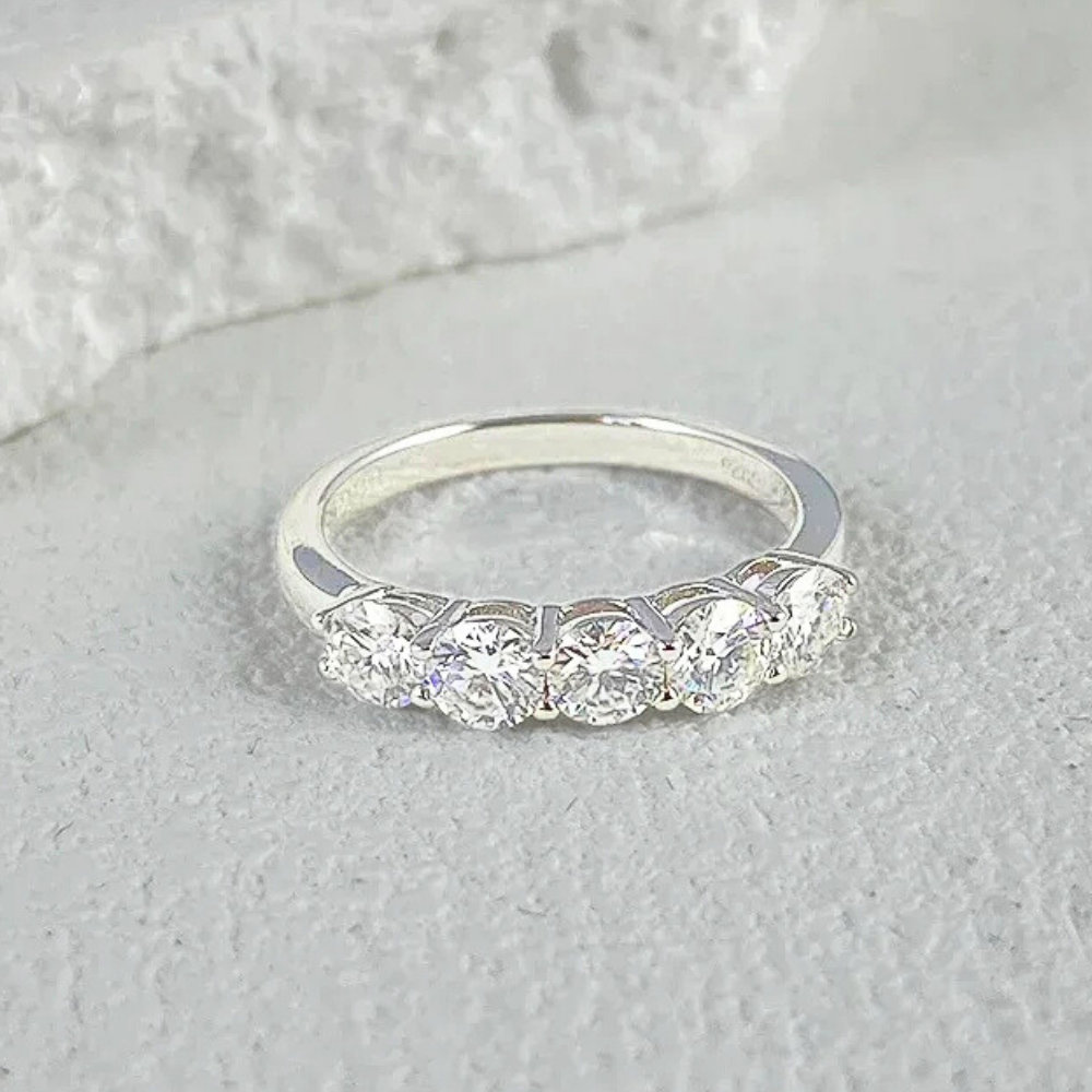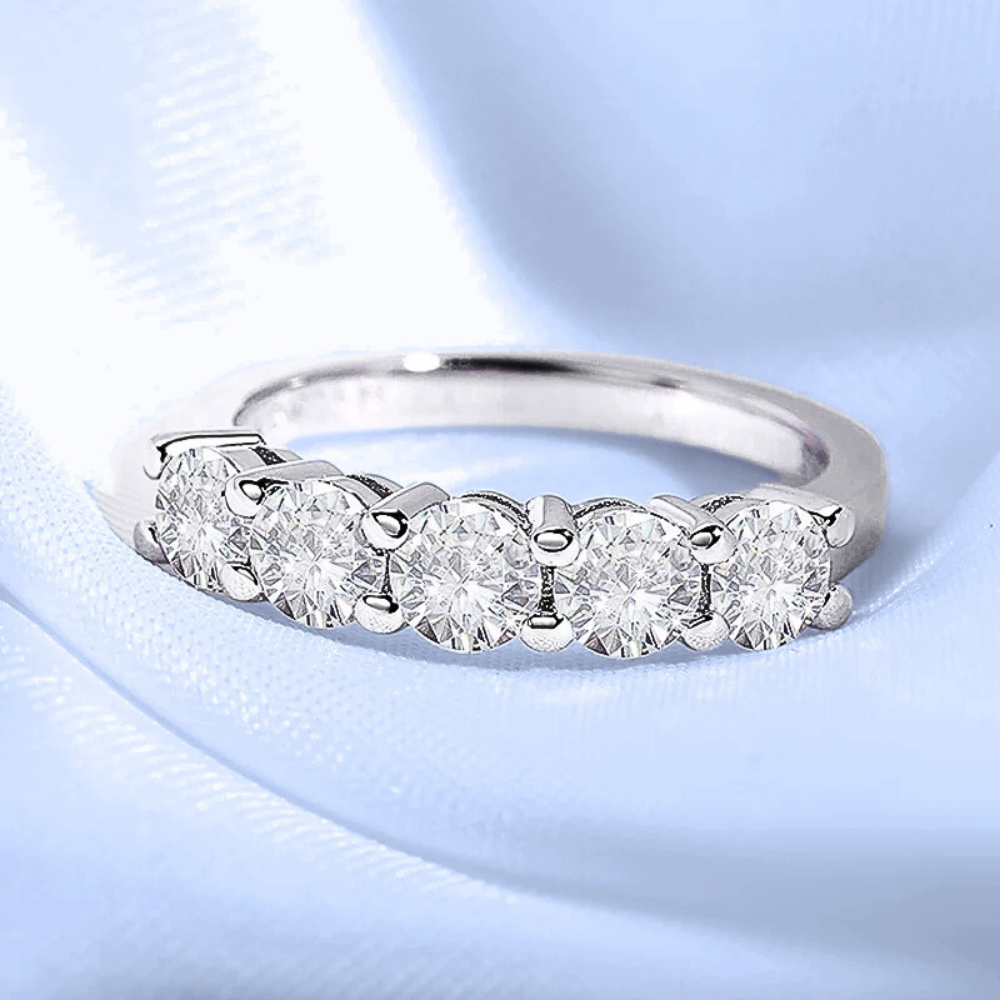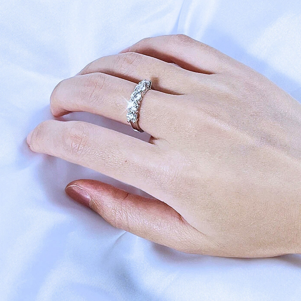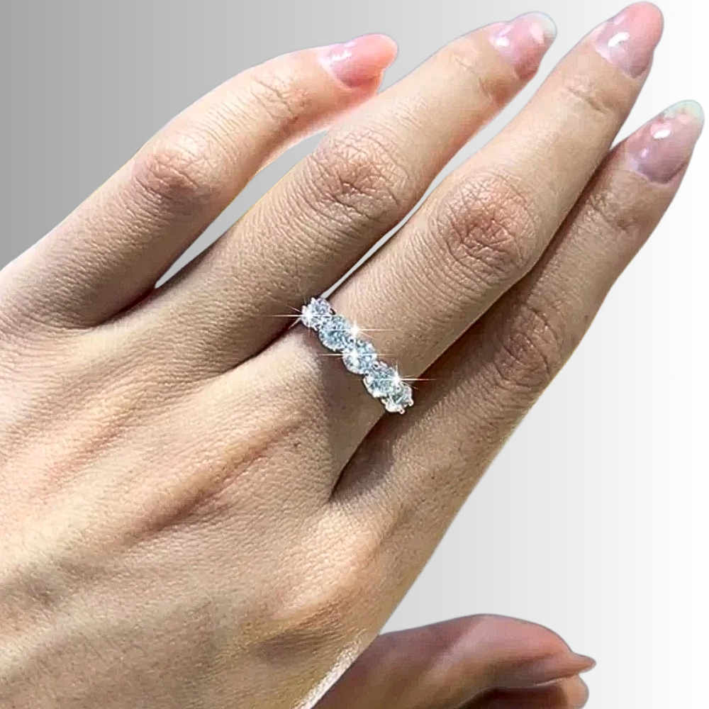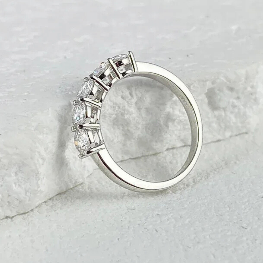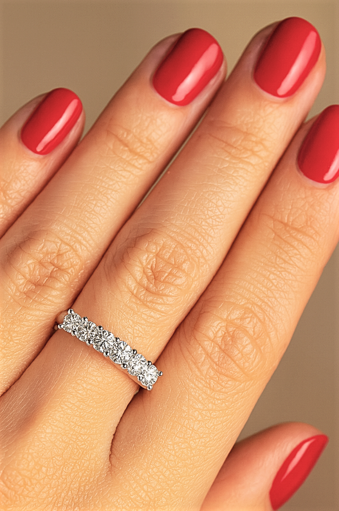 Cinque pietre, una linea pulita, un equilibrio immediato. Questa fede nasce per chi desidera un gioiello visibile ma misurato, capace di illuminare la mano senza risultare eccessivo. La disposizione regolare crea stabilità visiva e trasmette ordine, una sensazione rassicurante che si traduce in eleganza concreta. È una scelta consapevole: abbastanza luminosa da farsi notare, abbastanza essenziale da accompagnare ogni giorno. Un modo diretto di vivere il lusso, senza ostentazione.