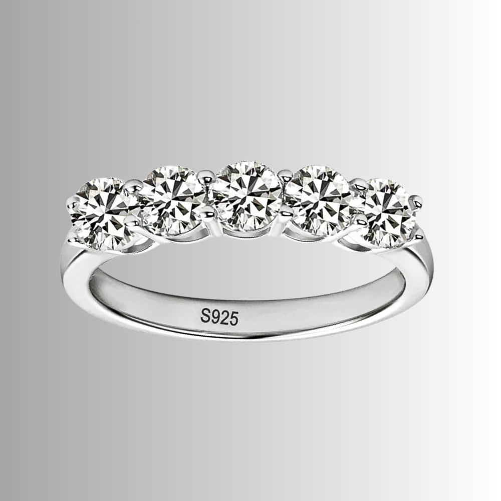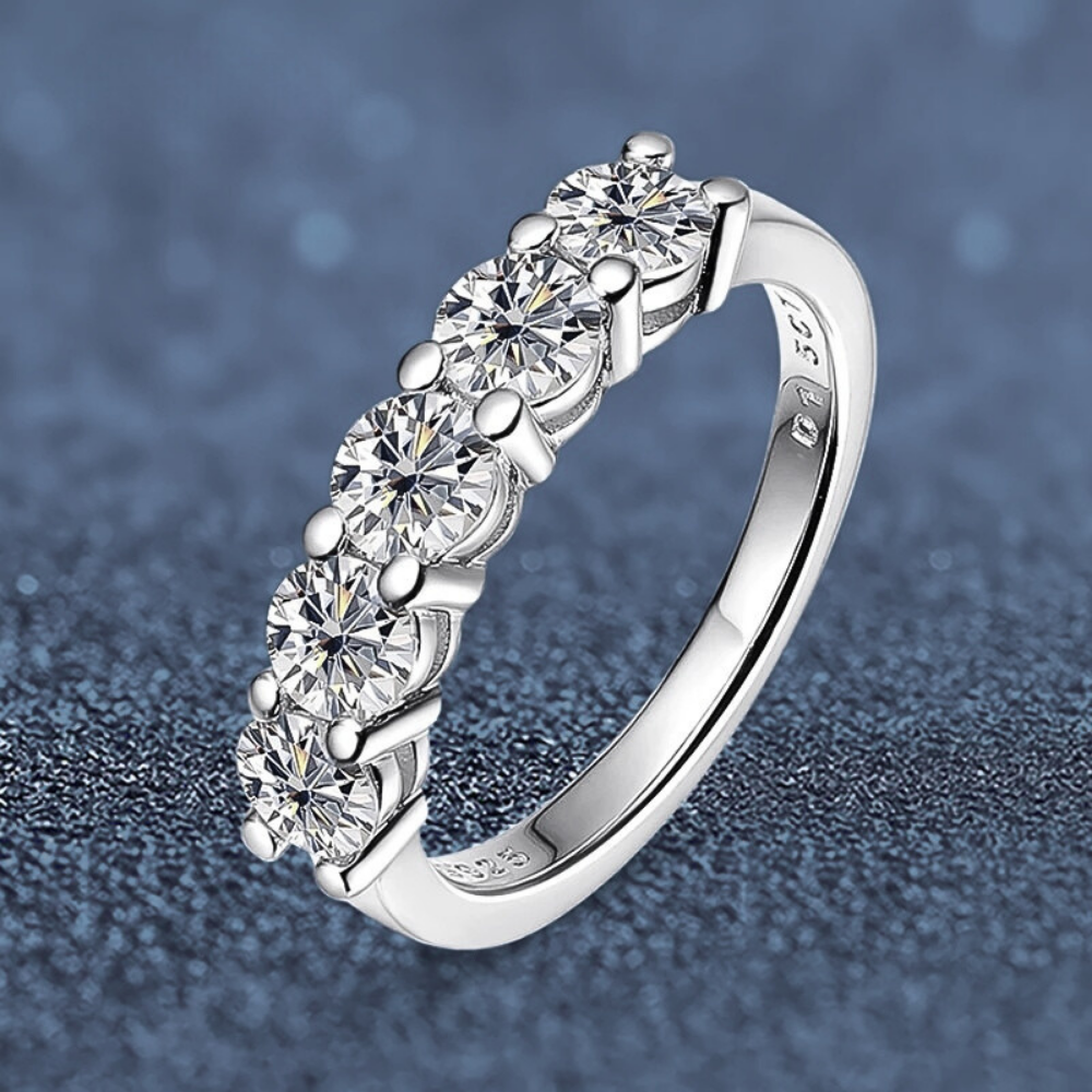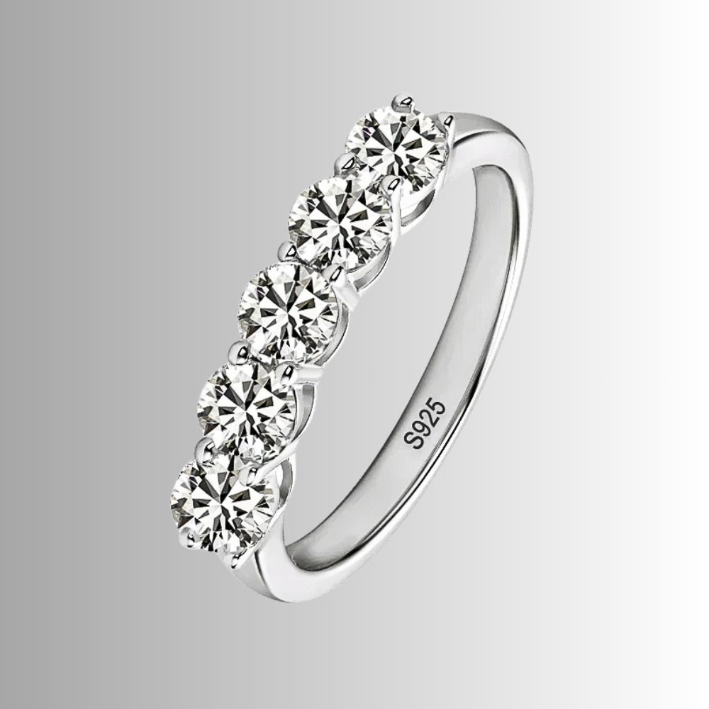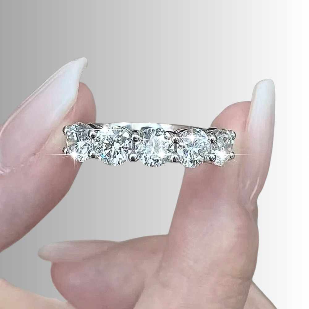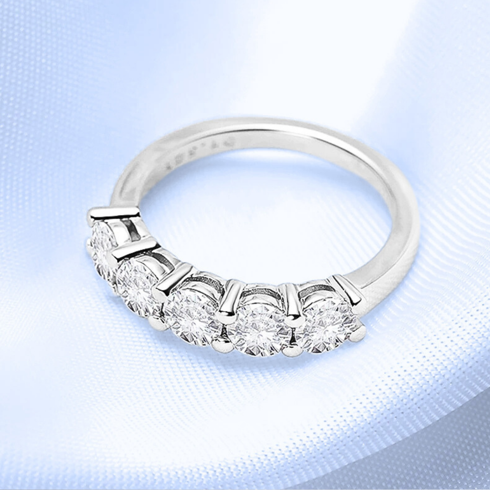 Cinque pietre, una linea pulita, un equilibrio immediato. Questa fede nasce per chi desidera un gioiello visibile ma misurato, capace di illuminare la mano senza risultare eccessivo. La disposizione regolare crea stabilità visiva e trasmette ordine, una sensazione rassicurante che si traduce in eleganza concreta. È una scelta consapevole: abbastanza luminosa da farsi notare, abbastanza essenziale da accompagnare ogni giorno. Un modo diretto di vivere il lusso, senza ostentazione.