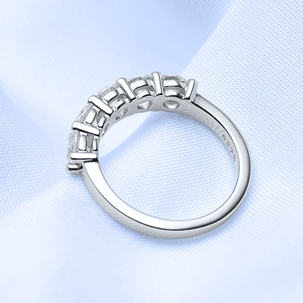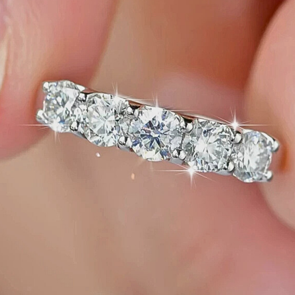 Ogni pietra da 0,30 carati contribuisce a un totale di 1,50 carati, offrendo una brillantezza definita e compatta. Il taglio esalta la rifrazione e restituisce una luce chiara, nitida, distribuita in modo uniforme lungo la fascia. Le griffe sottili mantengono le gemme ben salde e permettono alla luminosità di esprimersi con continuità.