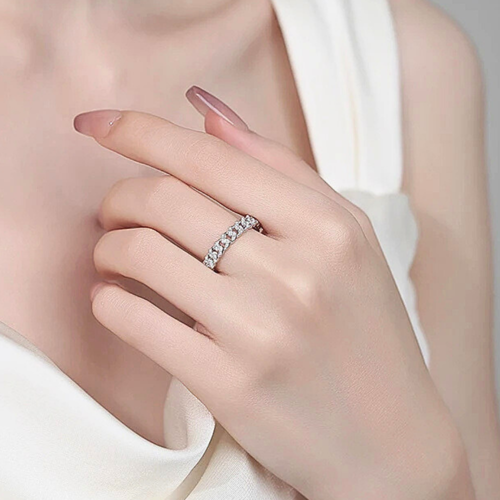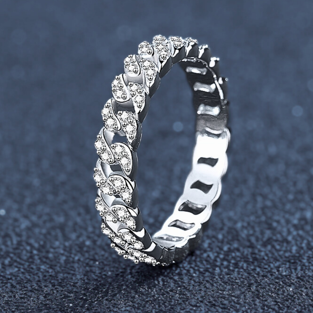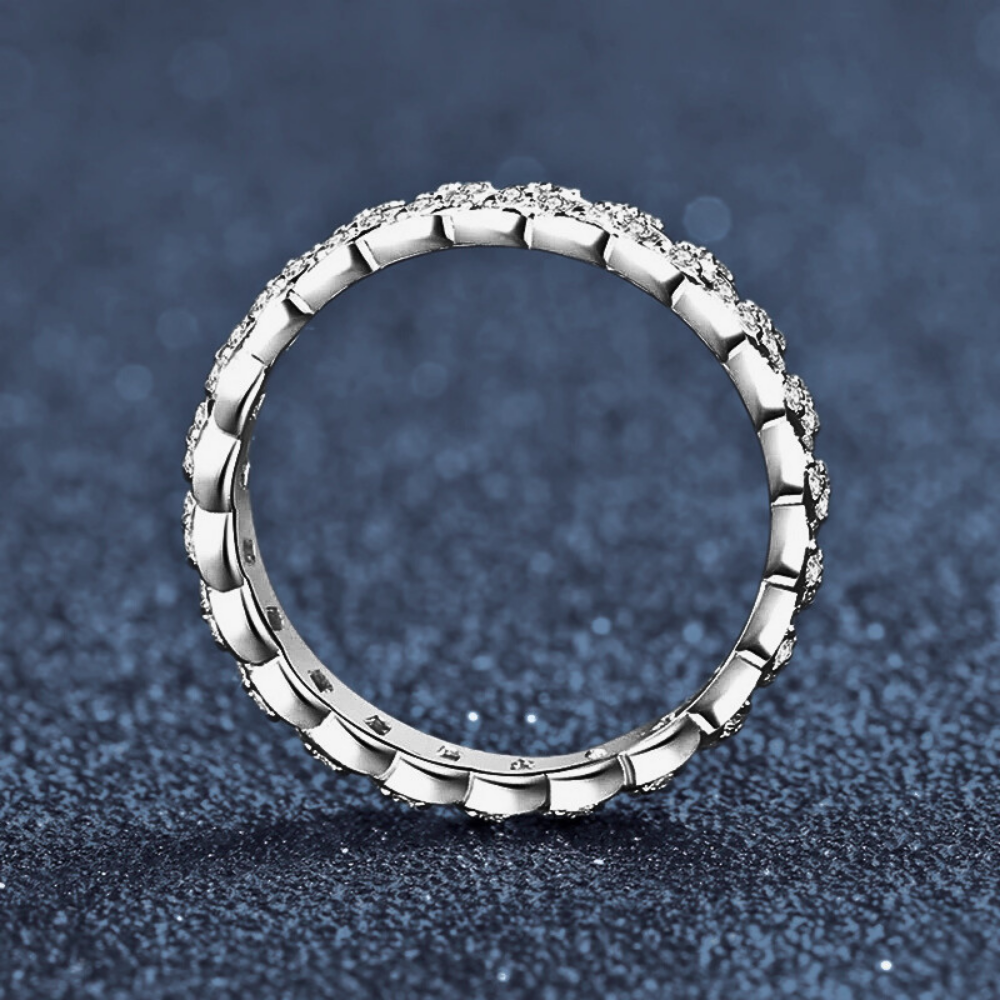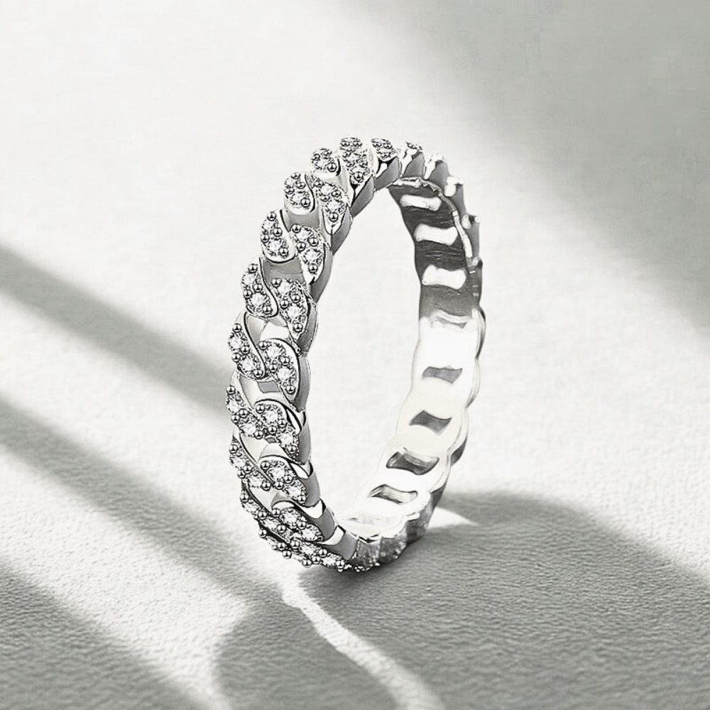 Una fedina che reinterpreta la classica maglia gourmette in chiave contemporanea. La struttura rigida crea un ritmo visivo ordinato e deciso, mentre i punti luce distribuiti lungo ogni segmento aggiungono profondità senza eccessi. Il risultato è un gioiello equilibrato, pensato per essere indossato ogni giorno.