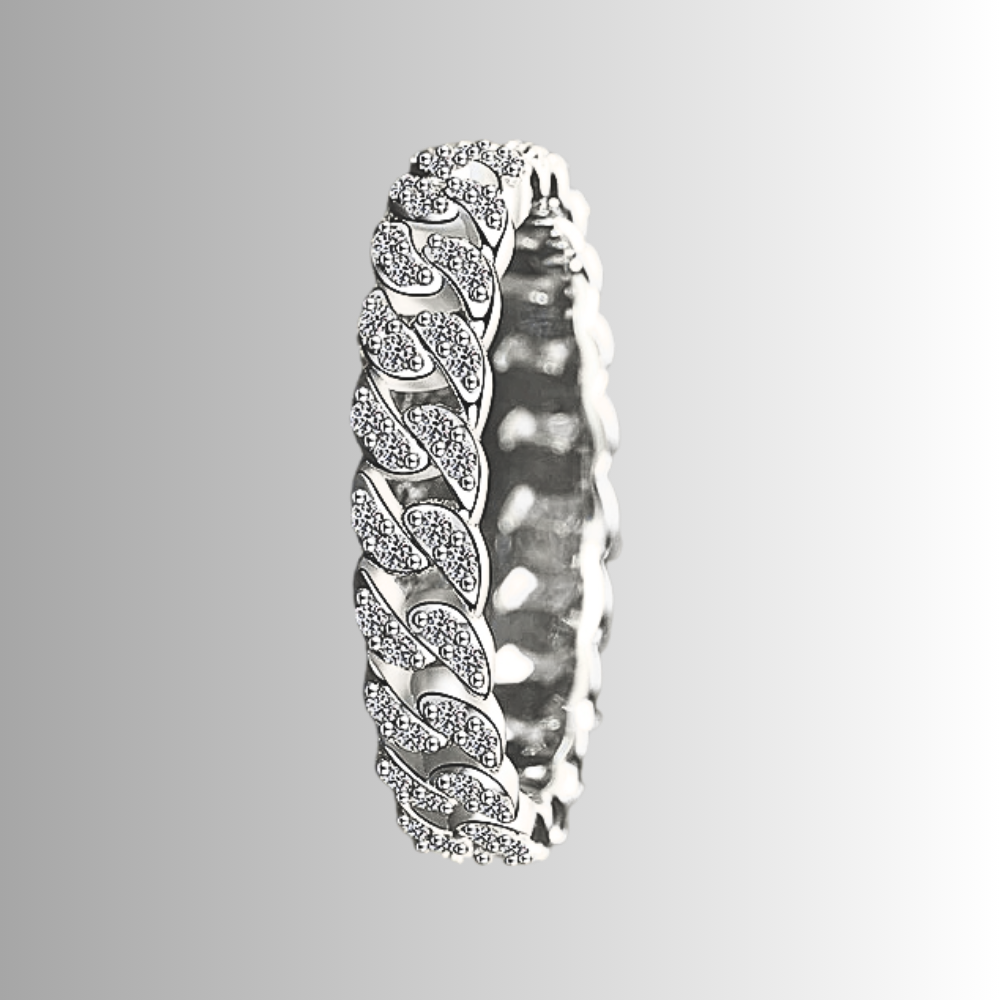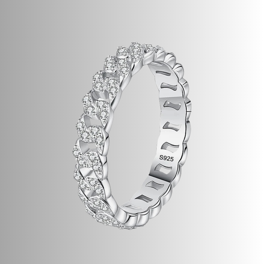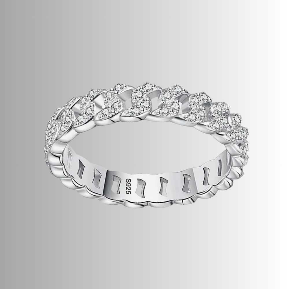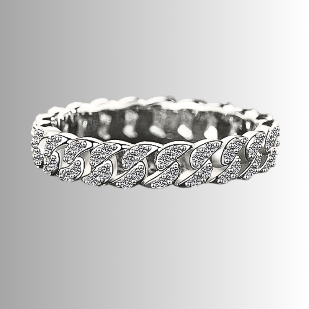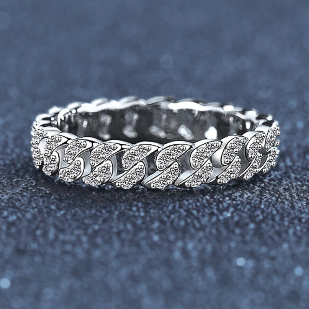 Una fedina che reinterpreta la classica maglia gourmette in chiave contemporanea. La struttura rigida crea un ritmo visivo ordinato e deciso, mentre i punti luce distribuiti lungo ogni segmento aggiungono profondità senza eccessi. Il risultato è un gioiello equilibrato, pensato per essere indossato ogni giorno.