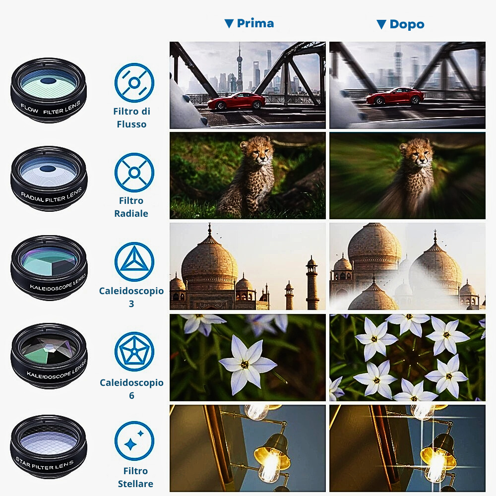 I 5 filtri del kit GlamLuxe non sono semplici accessori: sono strumenti professionali per dare personalità e originalità a ogni scatto, permettendo di ottenere effetti spettacolari direttamente in fotocamera, senza bisogno di software aggiuntivo.