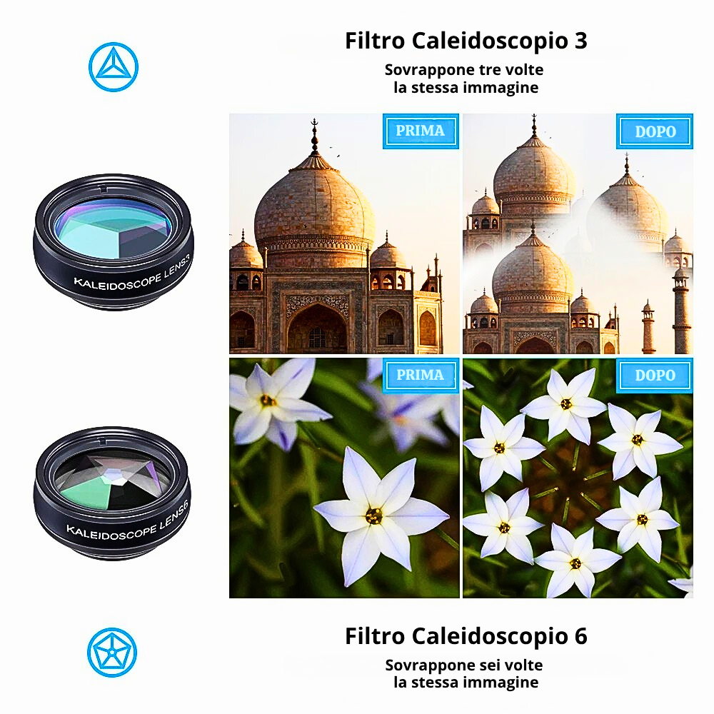 - Filtro Caleidoscopio 3 e 6: Filtra la luce attraverso una serie di lenti sfaccettate che creano duplicati di onde luminose. Il filtro 3 genera tre immagini ripetute, il filtro 6 sei immagini creando pattern luminosi simili a quelli di un caleidoscopio o dell’occhio di un insetto. Produce effetti psichedelici e fantasiosi che trasformano ogni fotografia in un’opera creativa, ideale per ritratti originali o composizioni artistiche.