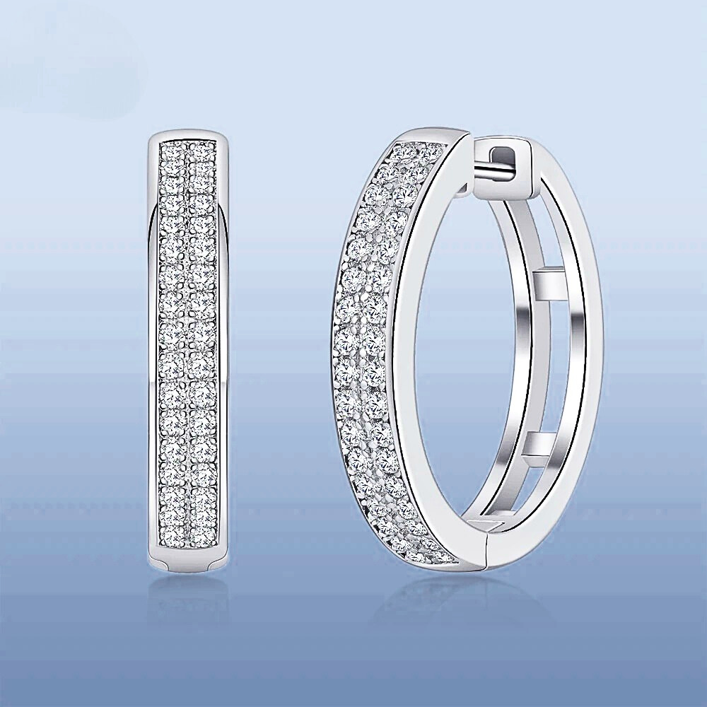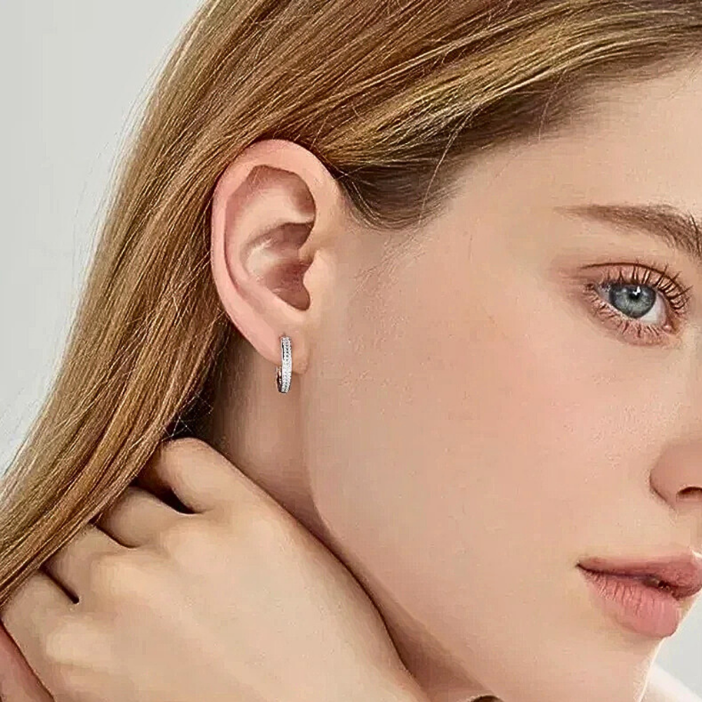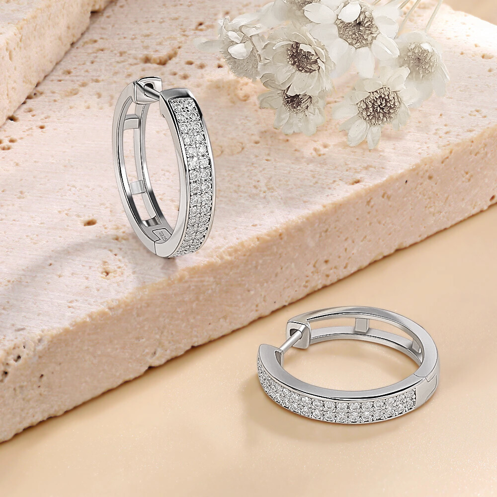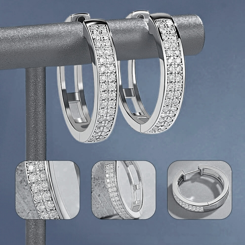 La parte frontale è impreziosita da due file parallele di moissaniti perfettamente allineate che seguono il profilo dell’anello. In totale sono presenti 68 moissaniti da 1 mm, ciascuna da circa 0,005 carati, selezionate in colore D e purezza VVS1. Questa disposizione crea una superficie luminosa compatta che riflette la luce in modo uniforme, esaltando la geometria dell’orecchino senza appesantire il design.