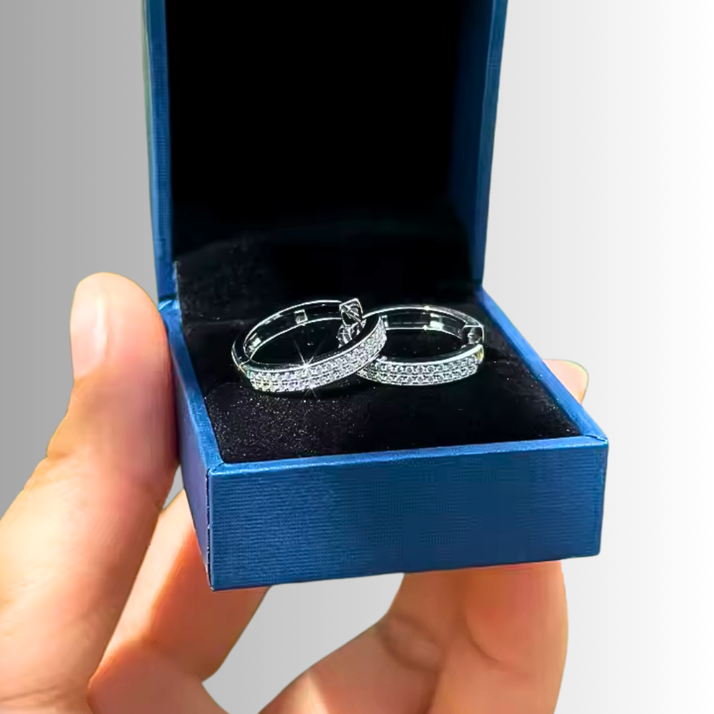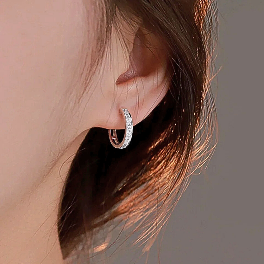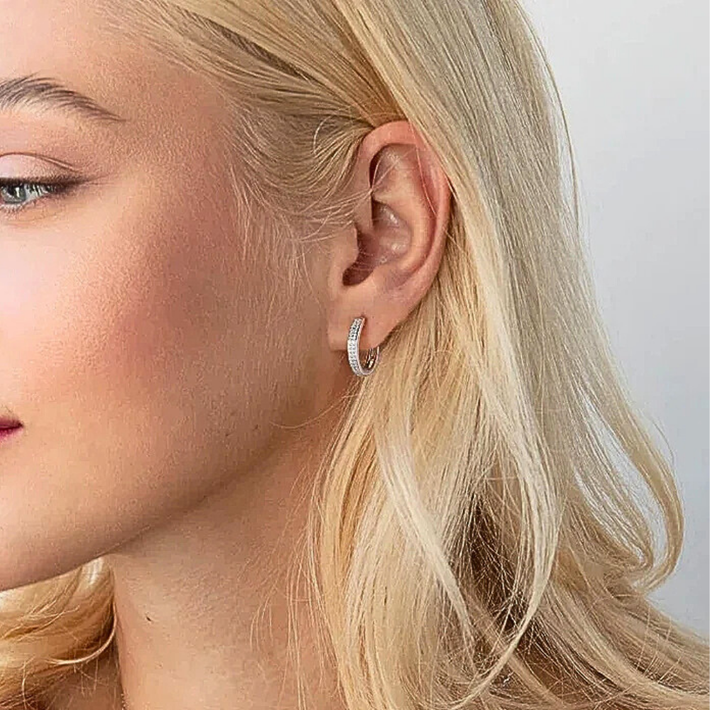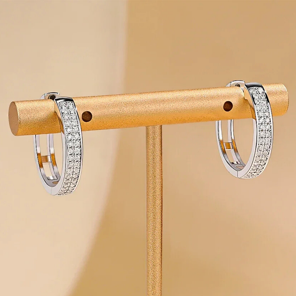 La parte frontale è impreziosita da due file parallele di moissaniti perfettamente allineate che seguono il profilo dell’anello. In totale sono presenti 68 moissaniti da 1 mm, ciascuna da circa 0,005 carati, selezionate in colore D e purezza VVS1. Questa disposizione crea una superficie luminosa compatta che riflette la luce in modo uniforme, esaltando la geometria dell’orecchino senza appesantire il design.