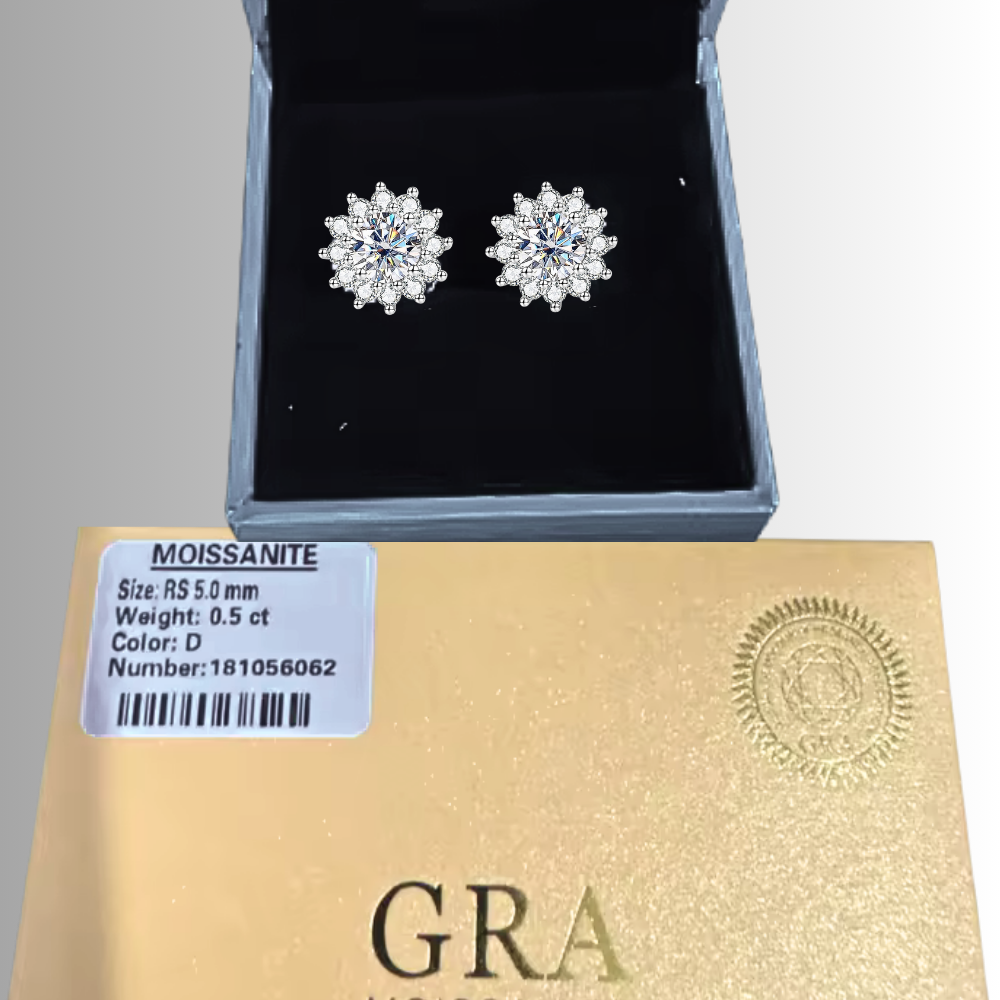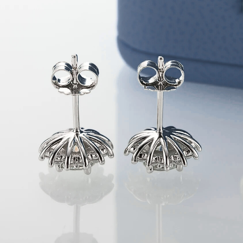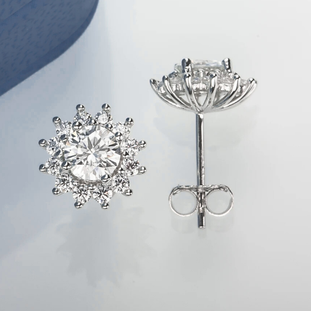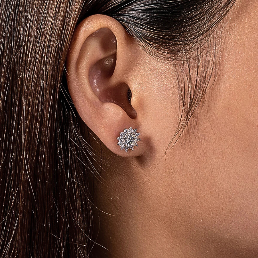Al centro, una moissanite D color VVS1 da 5 mm (ct 0,50 per orecchino), certificata GRA, è incastonata a quattro punte, creando un fulcro brillante e ben definito. Attorno, dodici brillantissime piccole gemme premium create in laboratorio da 2 mm disegnano una corona ordinata e compatta. Le pietre sono fissate con una tecnica che alterna punte condivise verso l’interno e terminali arrotondati più evidenti all’esterno, dando forma a petali sottili e regolari.