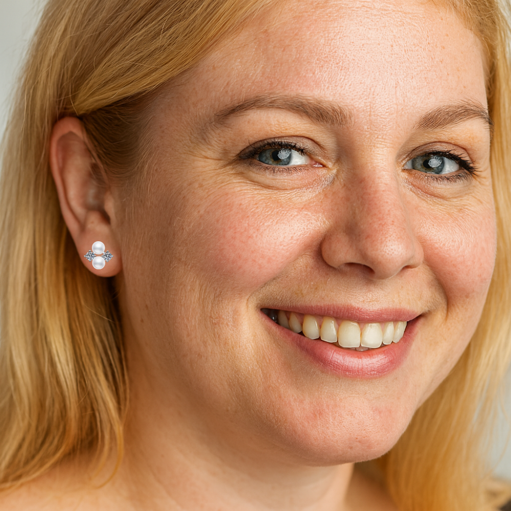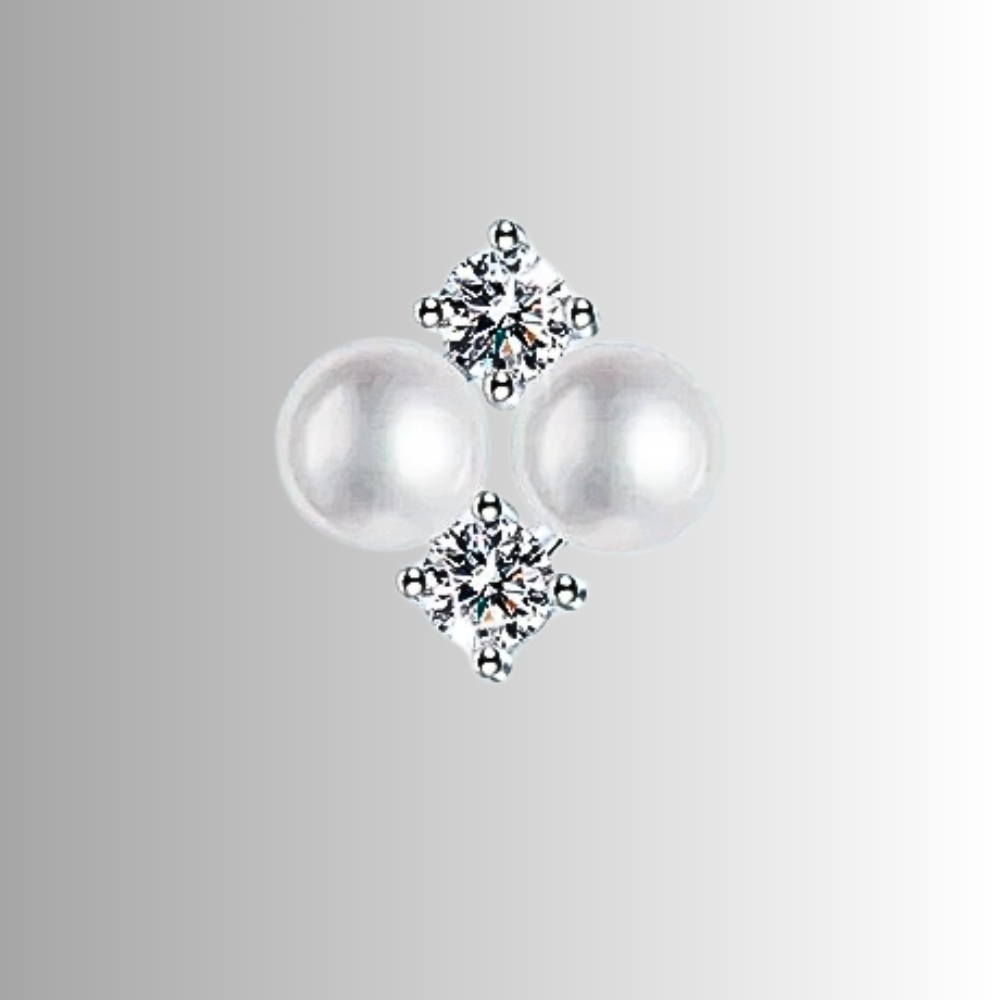 La composizione misura 12 x 12 mm e si sviluppa su due assi. In verticale sono sovrapposte due perle naturali d’acqua dolce da 6 mm a bottone, selezionate per regolarità e luminosità. In orizzontale si collocano due moissaniti D color VVS1 da 3,5 mm, per una caratura complessiva di 0,80 ct, incastonate in castoni a 4 punte che valorizzano la rifrazione della luce. L’insieme crea una croce equilibrata, dove la morbidezza della perla incontra la brillantezza netta della pietra.