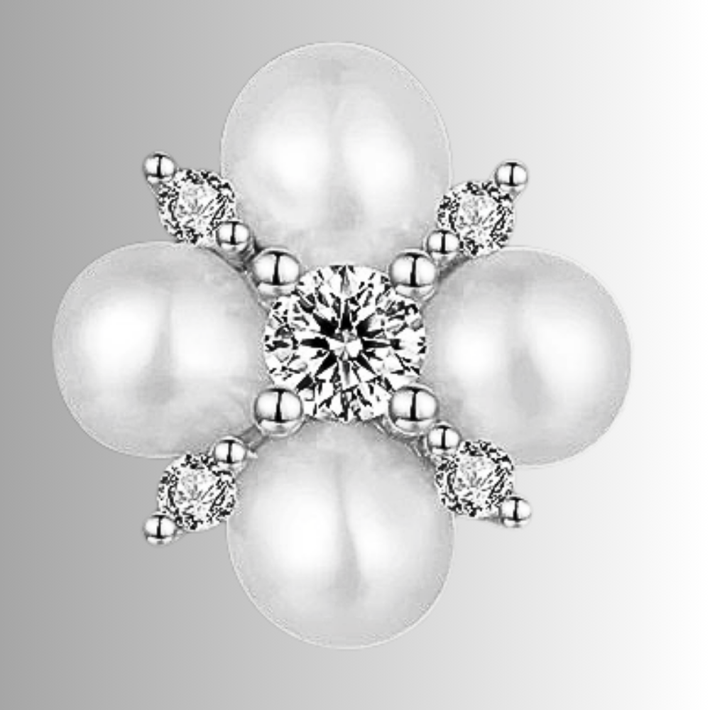 Il centro del quadrifoglio ospita un castone a 4 punte con una moissanite D color VVS1 da 2 mm, circondata da altre 4 moissaniti da 1 mm che completano la struttura fino a raggiungere una caratura complessiva di 0,46 ct. Le quattro perle naturali d’acqua dolce da 3 mm, posizionate a croce, intersecano armoniosamente le pietre creando una X centrale luminosa, esaltando la geometria e la luce del piccolo gioiello.