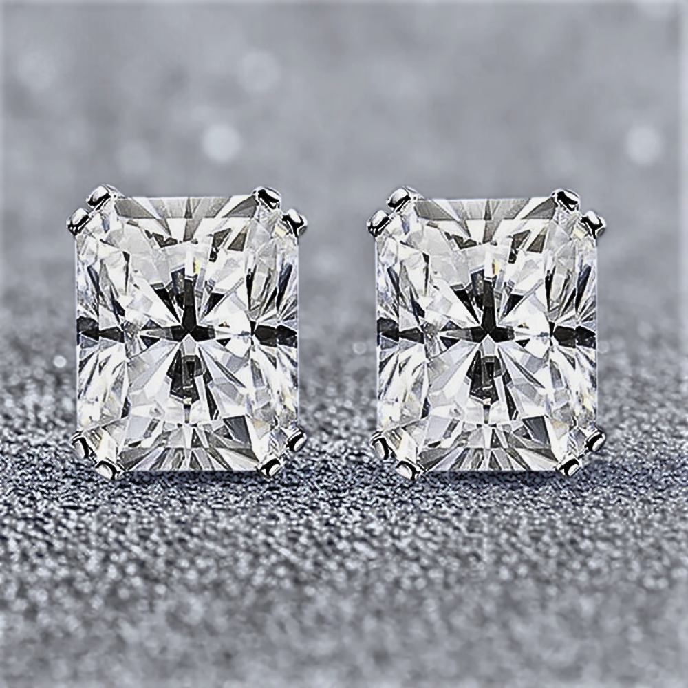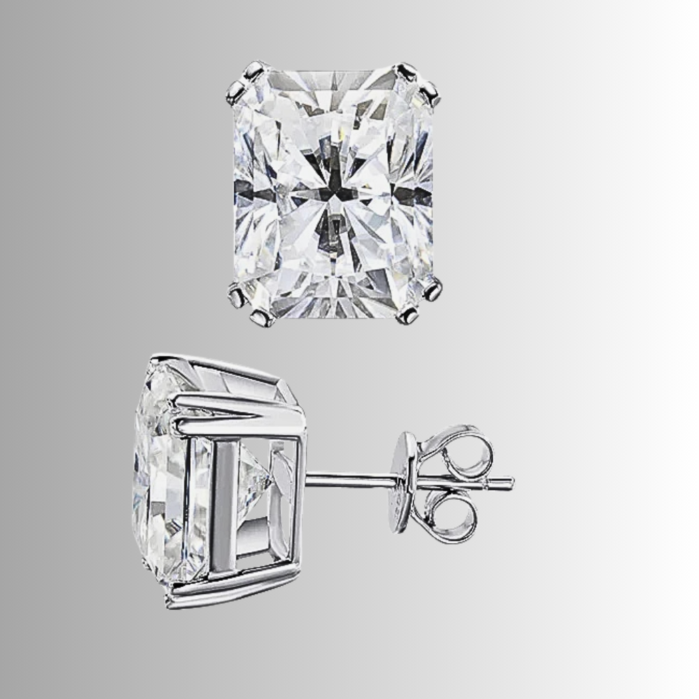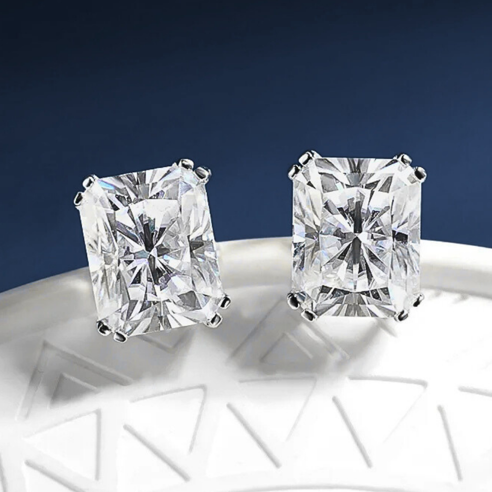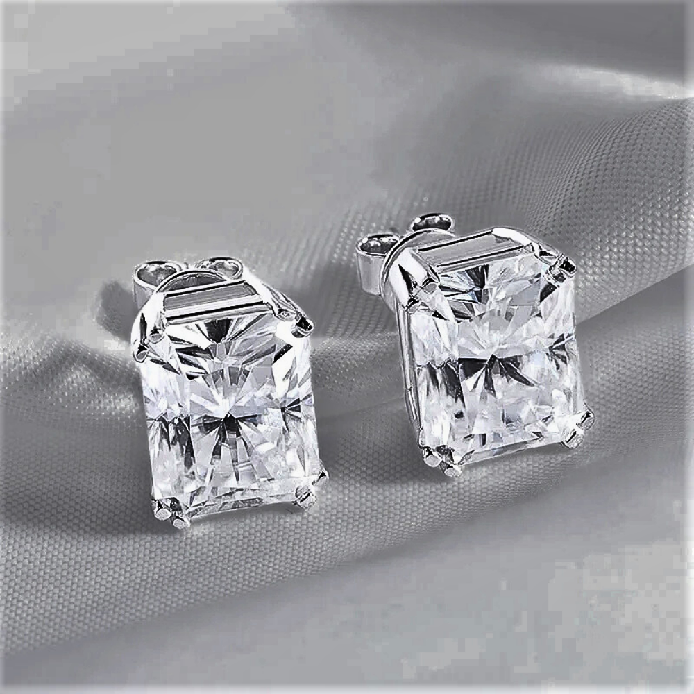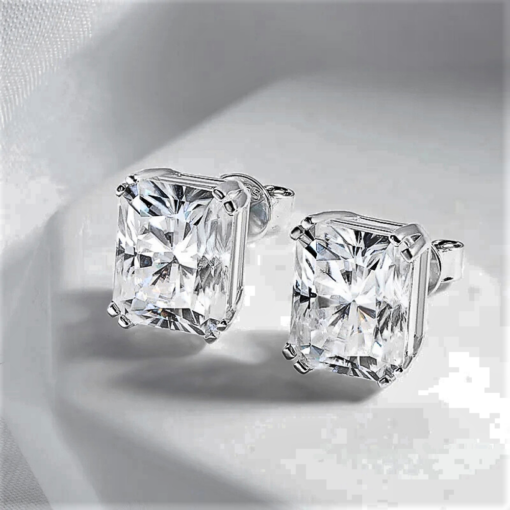 Linee pulite, proporzioni equilibrate e una brillantezza intensa definiscono questi orecchini punto luce con moissanite taglio Radiant. La forma rettangolare con angoli smussati unisce la struttura elegante del taglio smeraldo alla vivacità del taglio brillante, creando riflessi profondi e dinamici. Il risultato è una luce più ampia e stratificata, capace di valorizzare i lineamenti con presenza sofisticata ma sempre armoniosa.