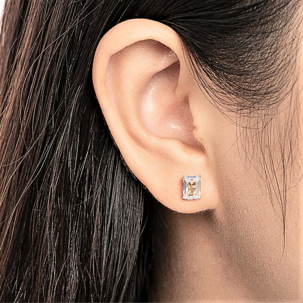 Gli orecchini punto luce con moissaniti taglio smeraldo esprimono una raffinatezza essenziale, costruita su proporzioni equilibrate e linee pulite. La forma rettangolare allungata dona slancio e armonia al viso, mentre la particolare struttura del taglio crea riflessi profondi e ordinati. Non si tratta di una brillantezza esplosiva, ma di una luce composta e raffinata, capace di emergere con naturalezza. Una scelta ideale per chi apprezza gioielli eleganti, discreti e perfettamente equilibrati nel design.