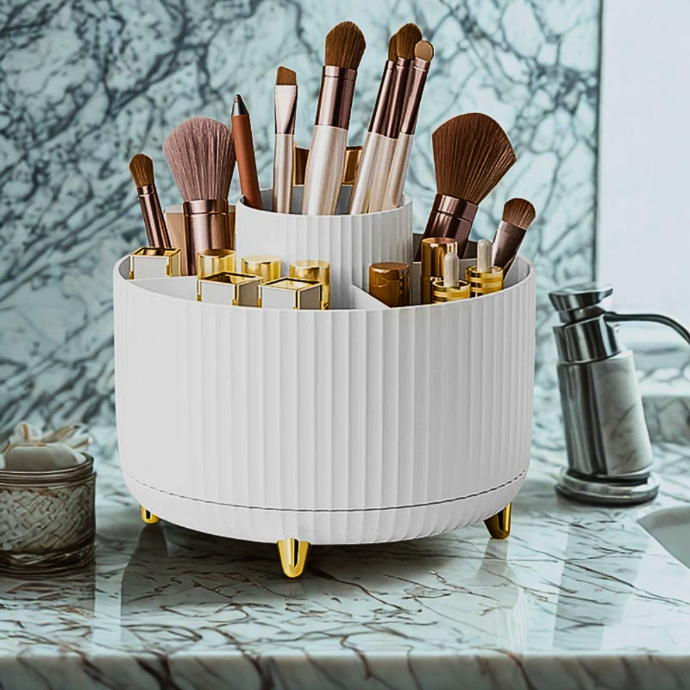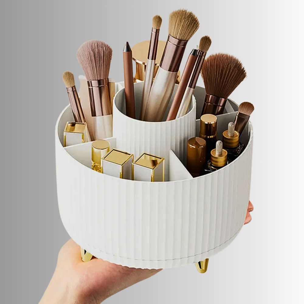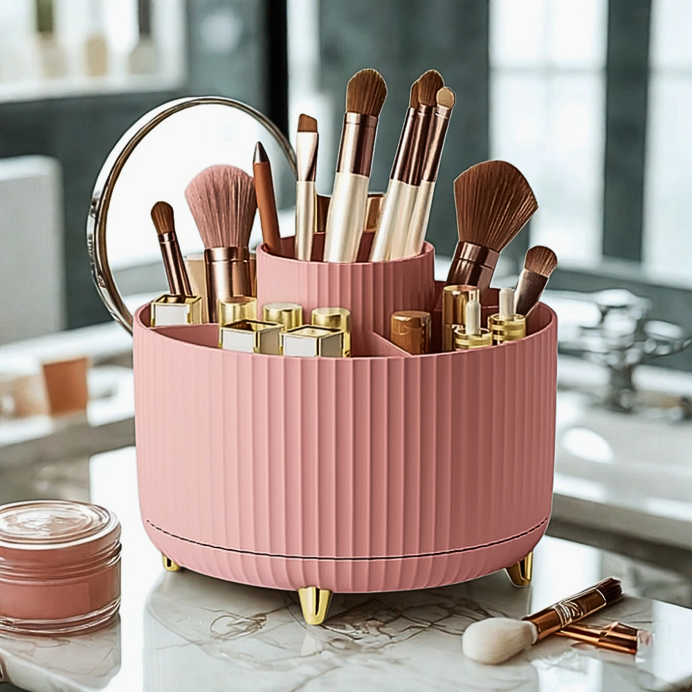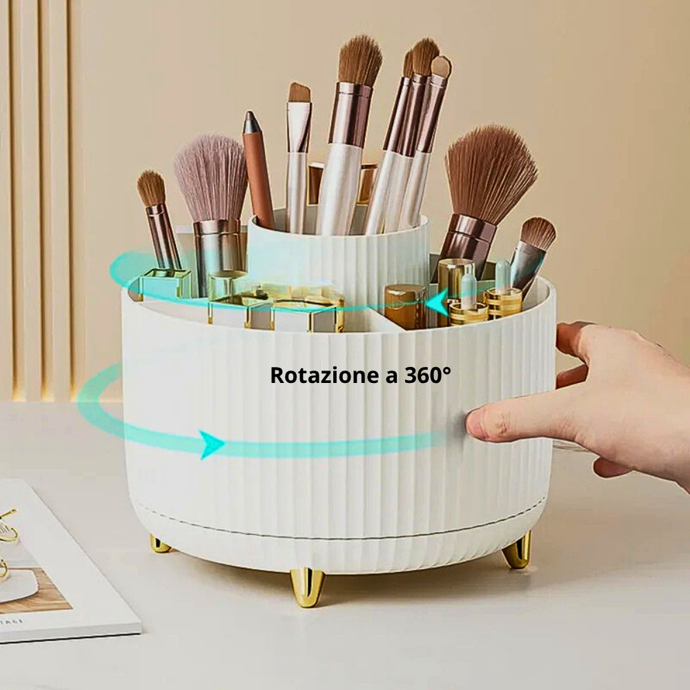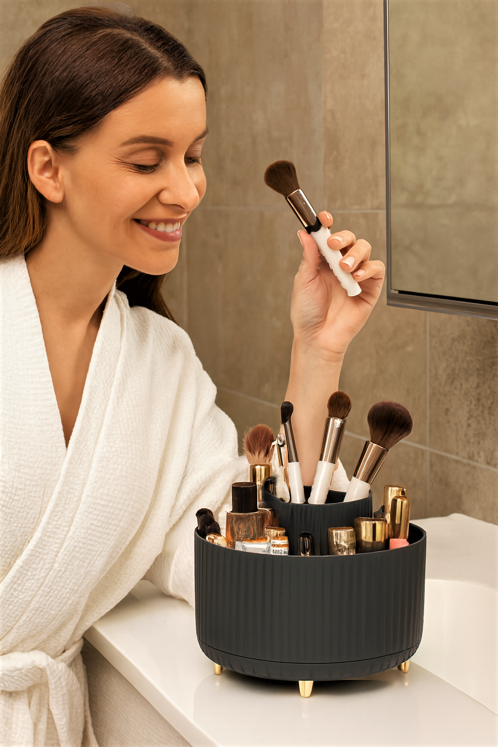 La sua struttura rotante a 360° rende l’accesso istantaneo: basta un gesto per avere sotto mano pennelli, rossetti, skincare, mascara o ciò che usi più spesso. Addio a trucchi nascosti sul fondo dei cassetti: tutto è visibile, ordinato e pronto all’uso.