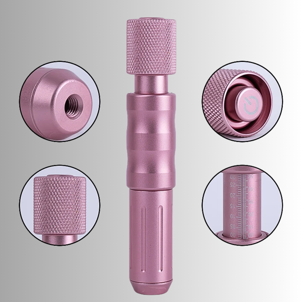 La modalità operativa unica della penna utilizza l'atomizzazione ad alta pressione per fornire trattamenti senza il disagio di un ago. Questo approccio innovativo riduce al minimo il rischio di infezioni e cicatrici, rendendo la scelta eccellente per chi è soggetto a tali problemi. La profondità di iniezione del getto prodotto va da 6 a 15mm e garantisce che il trattamento arrivi agli strati target della pelle, aumentando l'assorbimento efficace delle sostanze iniettate. Il design della penna non è solo elegante ma anche ergonomico, consente una manipolazione precisa e confortevole durante il processo di trattamento. Dotato di un sistema a molla e pistone, la penna per mesoterapia consente di iniettare le sostanze sotto la pelle attraverso un microscopico foro da 0,1 mm, garantendo un assorbimento rapido e risultati veloci, sicuri e indolori, senza i rischi associati all’uso di aghi tradizionali.