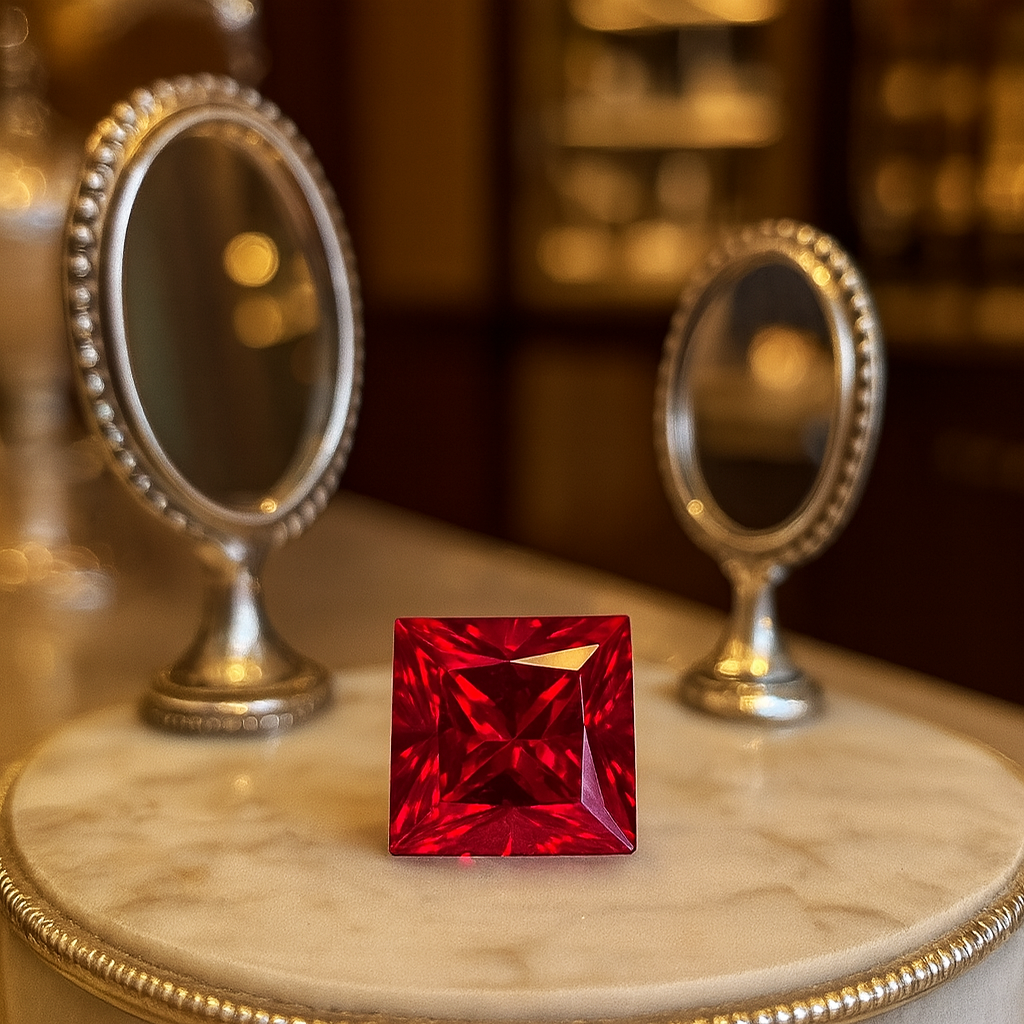 Il taglio Princess non mostra mai la stessa tonalità due volte: ogni movimento rivela un rosso in evoluzione, dal cremisi autorevole al vellutato intenso. È un taglio ideale per rubini dalla saturazione ricca, che necessitano di un taglio capace di esaltare tutta la loro energia cromatica.