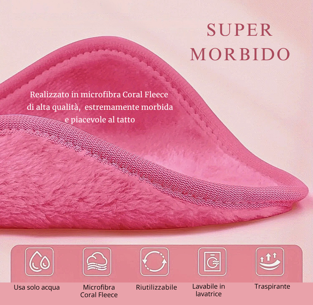 Dimentica le salviette usa-e-getta e i detergenti aggressivi: le Salviette Struccanti GlamLuxe in Microfibra Coral Fleece trasformano la pulizia del viso in un vero rituale di bellezza. Non è solo rimuovere il trucco… è regalare alla pelle un momento di benessere puro, in cui tutto diventa soffice, confortevole e sorprendentemente piacevole.La loro textura vellutata sfiora la pelle come una piuma preziosa, avvolgendola in una sensazione di comfort assoluto mentre cattura ogni residuo — dal fondotinta più leggero al waterproof più ostinato — con una delicatezza che sembra magia. Basta acqua, niente strofinamenti, niente irritazioni, niente prodotti chimici: solo un gesto fluido, naturale e profondamente rispettoso della pelle. Te ne accorgerai dal primo utilizzo: struccarsi non sarà più un passaggio obbligato della giornata, ma la coccola serale che aspetti con piacere. Un piccolo lusso beauty quotidiano, capace di chiudere la giornata con eleganza, cura e senso di armonia.